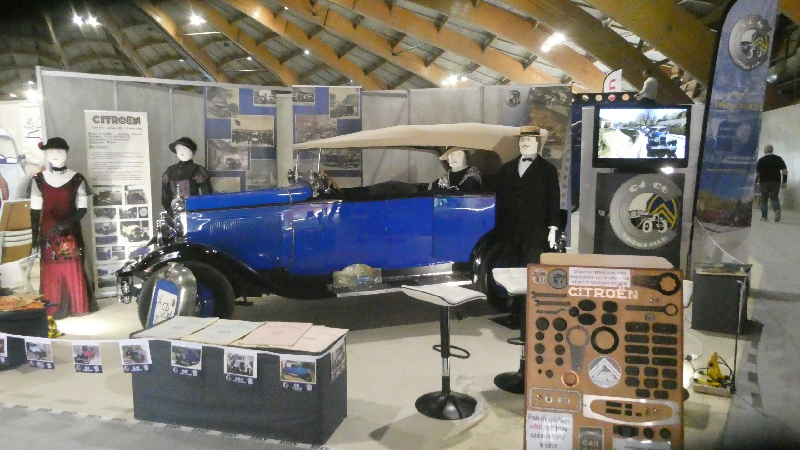 Le torpédo AC4 1929 de Jean-Marie présente ces messieurs et ces dames endimanchées accourant pour le Bal… Le phono est là, les revues d’époque également, retraçant les exploits des autochenilles en montagne l’hiver ou le tourisme en Provence… Et puis, pour donner de la vie à ce décor et montrer que notre club est actif, il y a la télévision qui déroule le film de nos activités de l’année de 2023 et présente celles qui vont arriver en 2024.